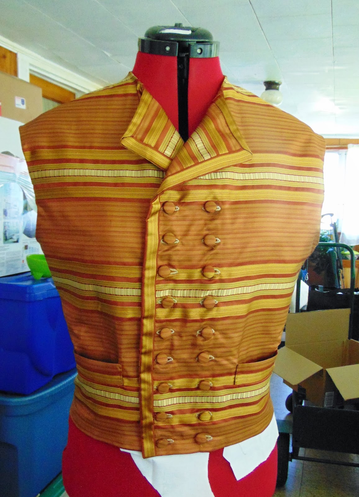 Below we have the waistcoat, all finished up with buttonholes already done. I'm sorry I skipped so many steps at the this point, but the rest before it was really just on-the-fly stuff having to do with facings and edge bindings,