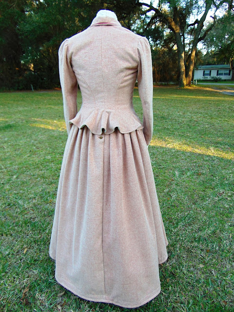 The client was looking for a slight mix of eras; the wider A line skirt of the 1890s, but without the large sleeves or shoulder puffs.