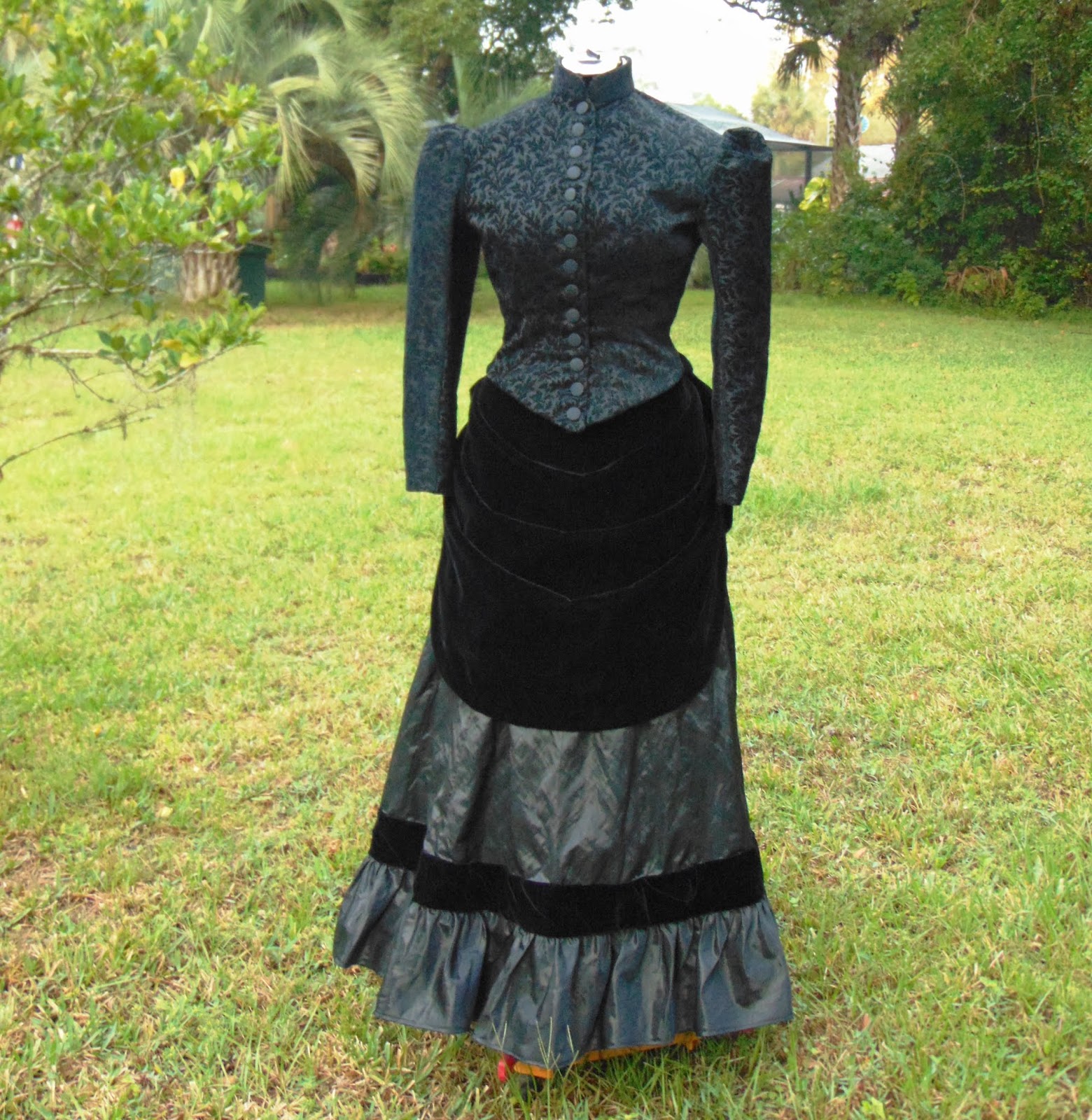 I then made facing pieces of the same black satin used on the skirt. The sleeves are lined in black cotton as well, slip-stitched to the armhole seam allowance by hand. The buttons are black silk taffeta over wooden rounds.